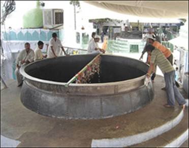 On either side of the second Buland Darwaza in front of Sahan Chirage (courtyard lamp), there are two huge Degs (cauldrons for cooking food) fixed into solid masonry in which a palatable mixture of rice, sugar, ghee (butter) and dried fruits is cooked for distribution to the public as tabarruk. The circumference at the edge of the larger cauldron is 10-1/4 feet. It cooks 70 mounds of rice, while the smaller Deg takes 28 mounds. One of them was presented by Akbar in 1567 A.D. The princes or the well-to-do pilgrims order these Degs to be cooked generally during the Urs period.